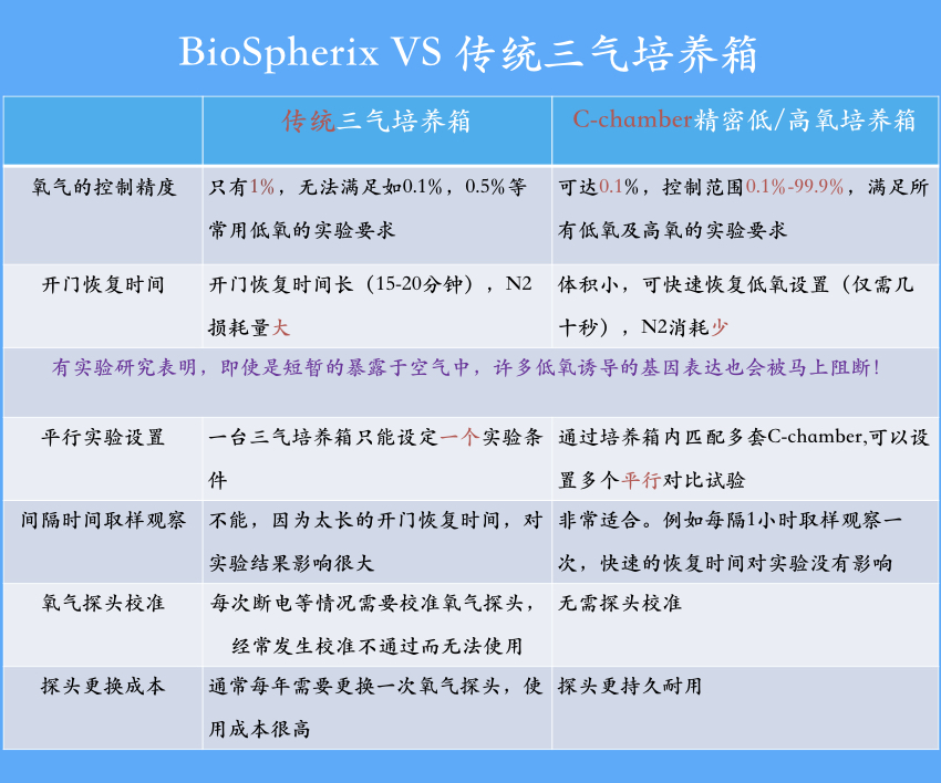 BioSpherix紧跟时代发展,不断优化设备性能以适应不断严格的实验要求,一直为全球科学家提供控制精度最高的低氧(高氧)培养箱,此设备性能远远优于传统的三气培养箱,便是公司“致力于为生命科学研究创造更好更适合的研究环境”这一奋斗目标的******体现。