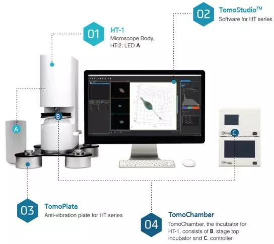 Tomocube推出的全息衍射断层扫描细胞成像系统:HT-1,世界首台革命性的全息衍射断层扫描技术(ODT),采用动态数字微镜装置,完全消除了机械移动光源成像模式的不稳定性和高误差。实现对活细胞内部结构、组分及分布情况的高分辨率实时三维成像分析,提供完整的细胞形态、细胞器观察、细胞干重及细胞膜动力学信息。