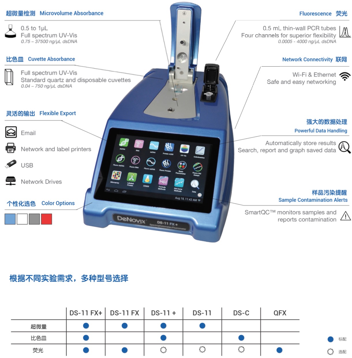 DS-11是一款真正为引领未来技术潮流而设计的超微量分光光度计,融合智能科技应用理念和先进的SmartPath?浓度检测技术。首次推出定制版智能安卓操作系统,界面直观,操作便捷,已成为其他品牌模仿的标杆。
