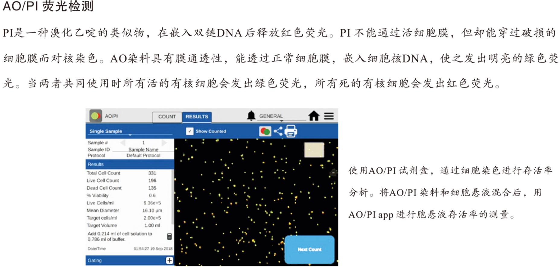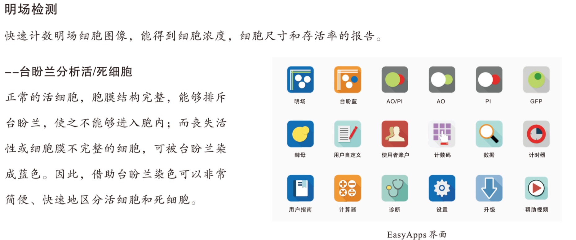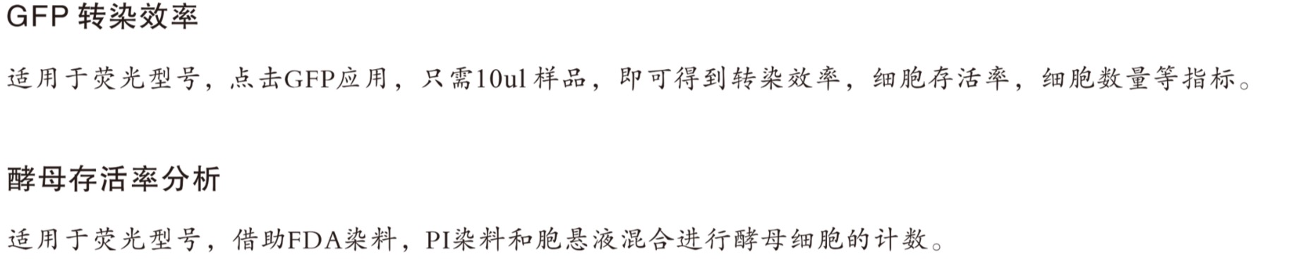 预装的明场、台盼蓝、AO/PI、GFP以及酵母检测模式,可以满足繁忙的大型实验室的应用